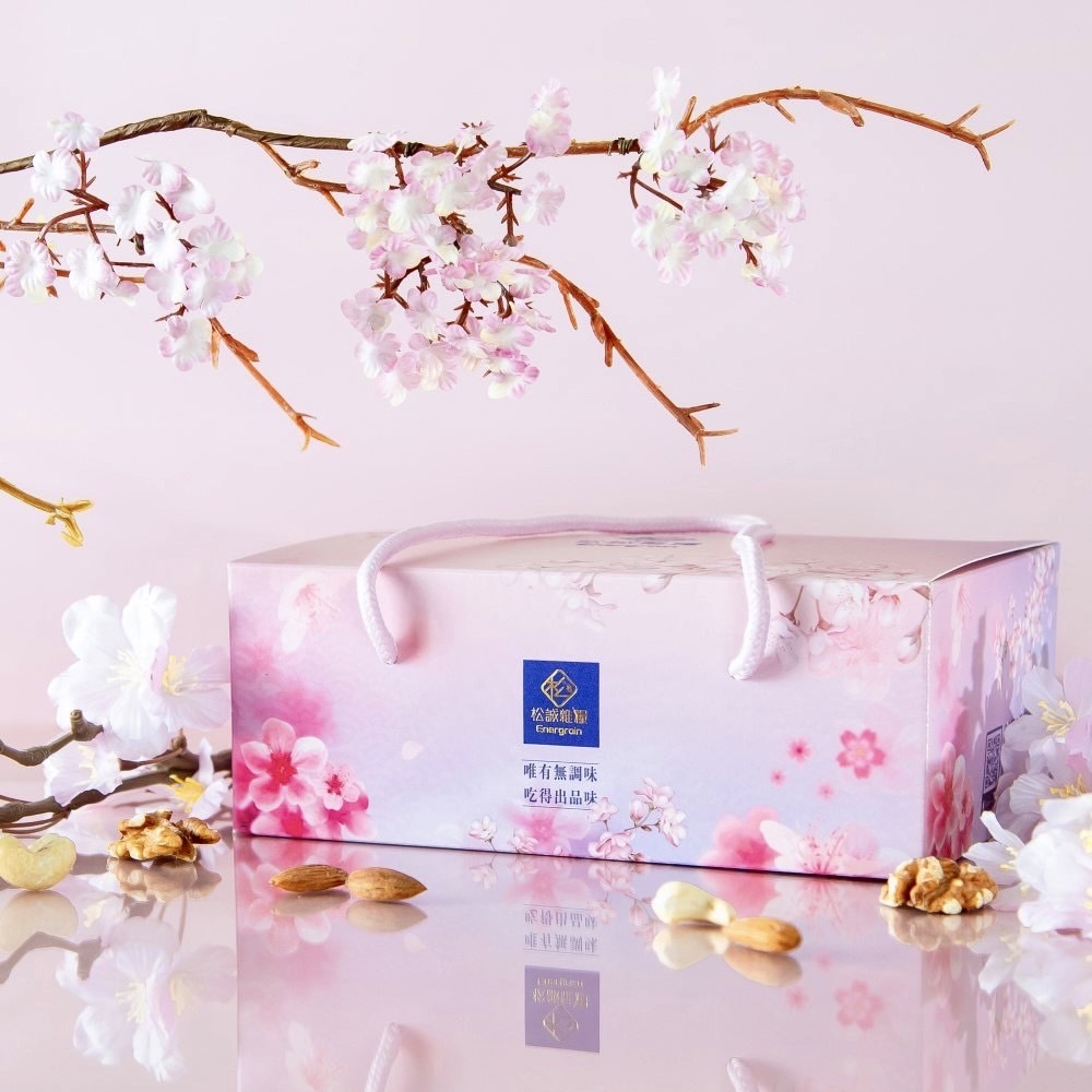 這份【堅果葡萄乾_櫻花禮盒】,整體的「櫻花」禮盒設計,搭配燙金的logo標誌