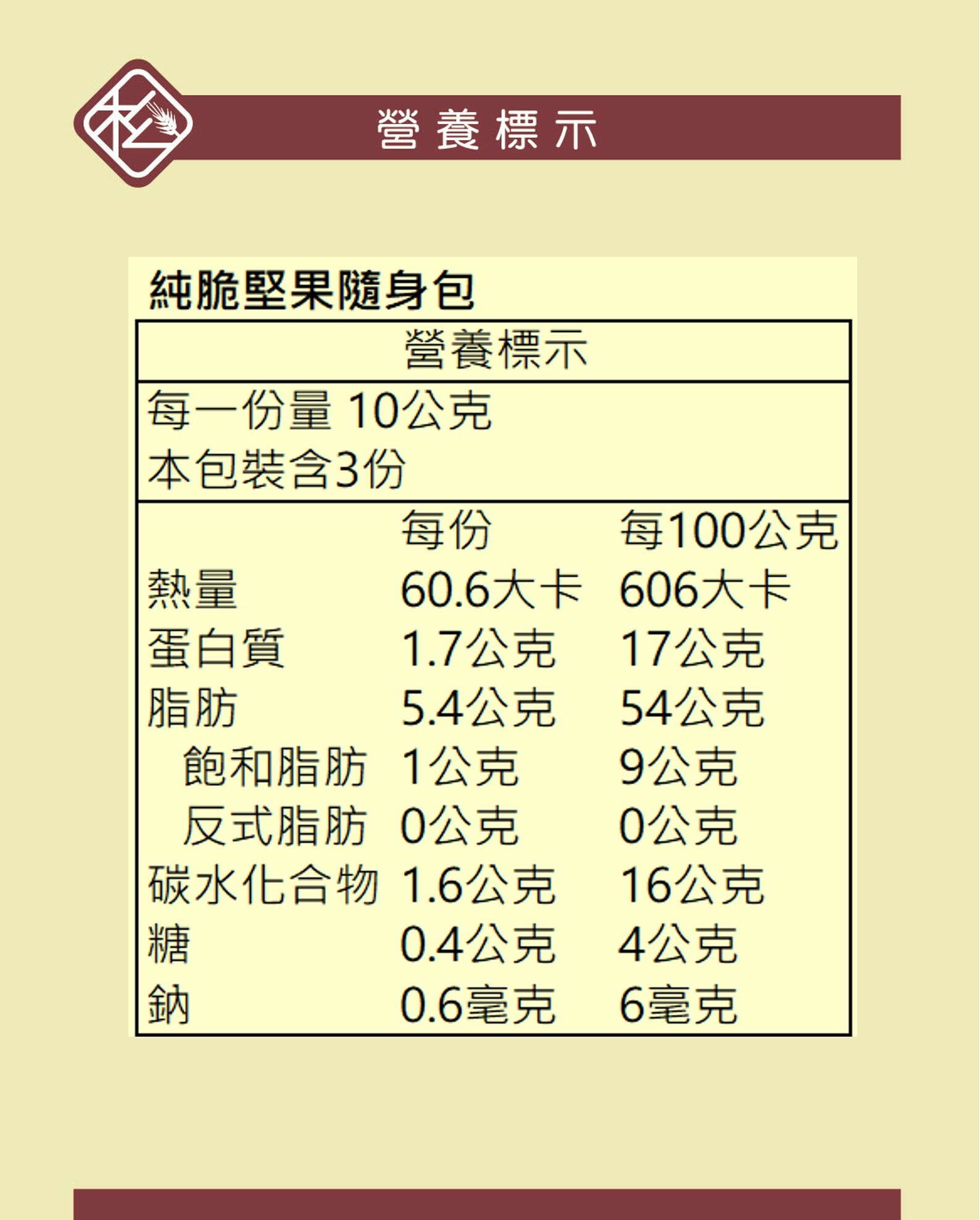 - 純脆堅果 (30g)* 10包: 腰果/杏仁果/核桃/胡桃/夏威夷果