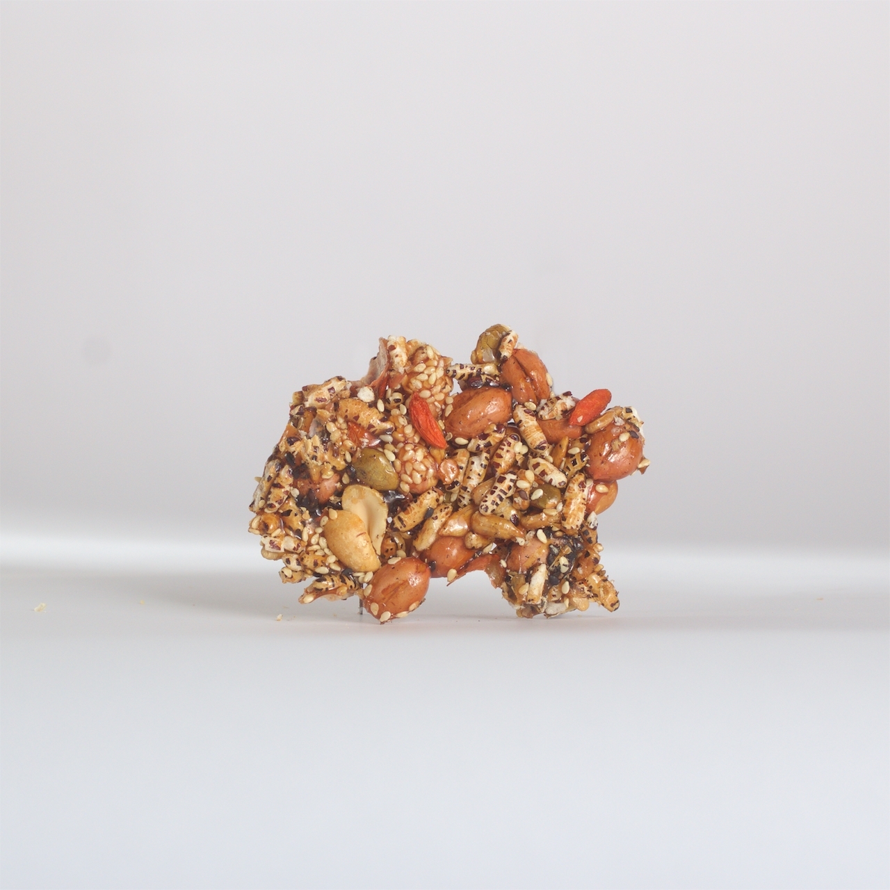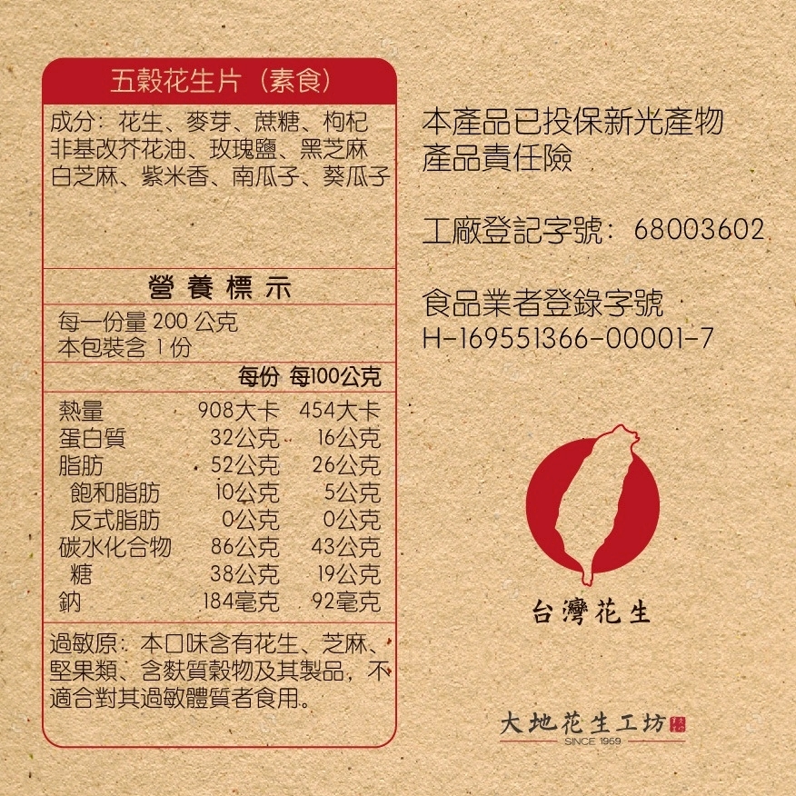 以整顆花生、黑芝麻、白芝麻、燕麥與穀麥片等多種天然食材製成,經手工拌炒與壓片工藝製作,保留花生的香氣與酥脆,同時兼具多穀的營養與層次口感。